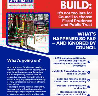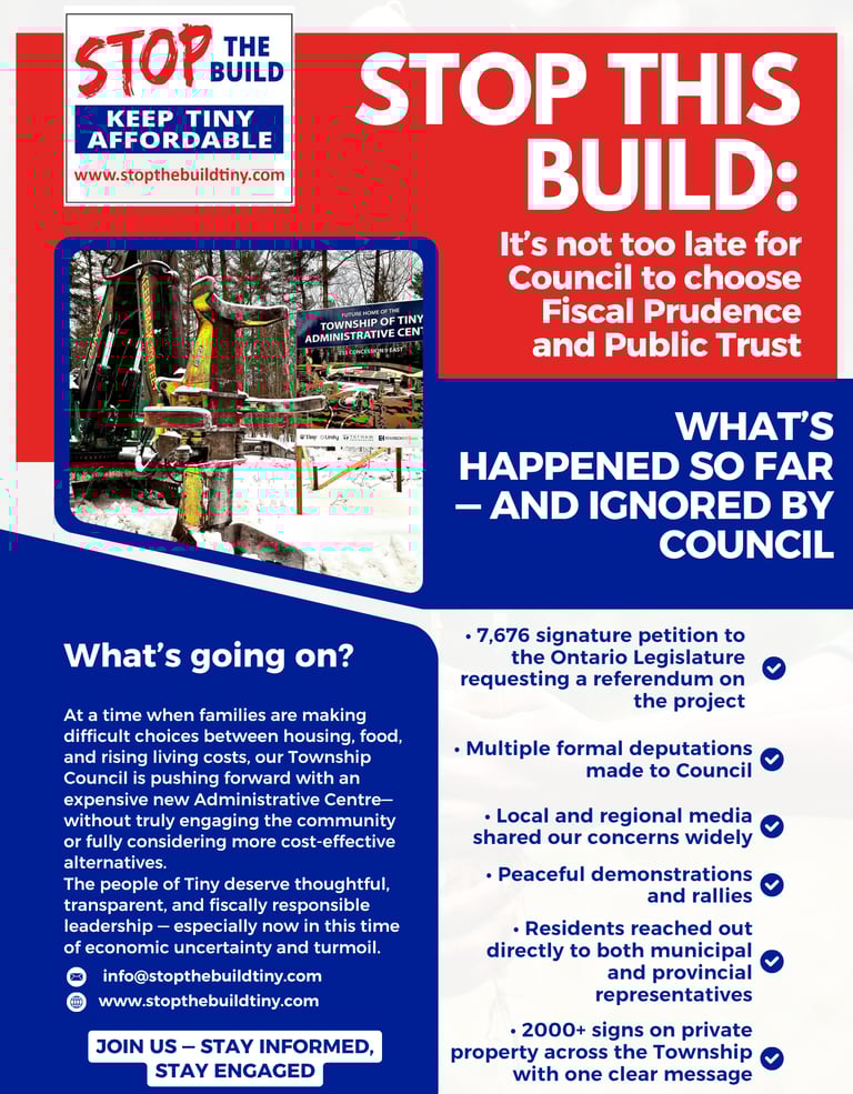 The "Stop the Build" campaign is an initiative led by a group of citizens from all backgrounds, walks of life, and political affiliations from Thunder Beach to the Tiny Flos Townline, brought together by a shared concern for the potential financial burden and lack of transparency surrounding this project. Our mission is to halt the proposed Municipal Administration Building project.