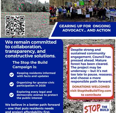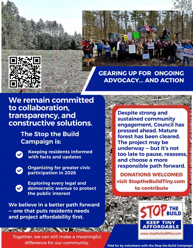 We invite all concerned residents and tax payers to join TinyTRA in supporting the Stop the Build Campaign. Together, we can ensure that the township's decisions are made transparently and in the best interests of its residents. Your involvement is vital to halting this project and advocating for responsible governance in Tiny Township.